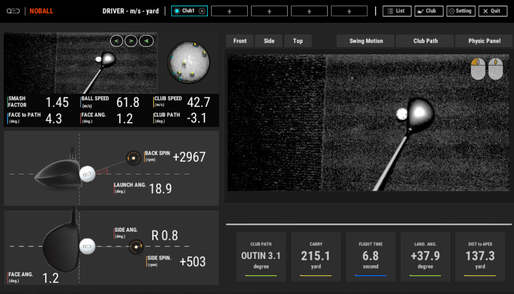 ボールやクラブの動きを完璧に捉えているので、飛距離、打球速度、スピン量などを実数値で表示させることが可能です。